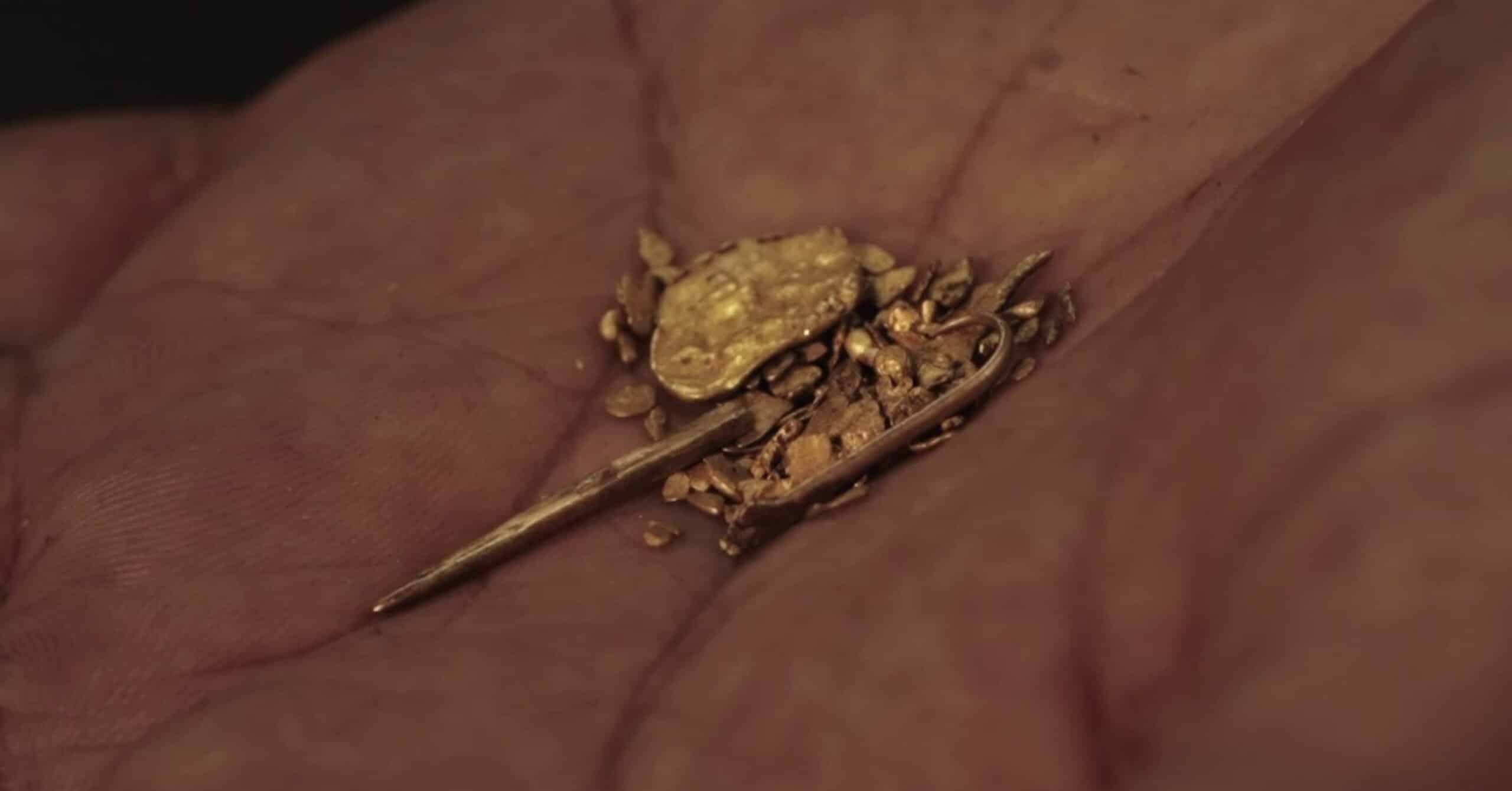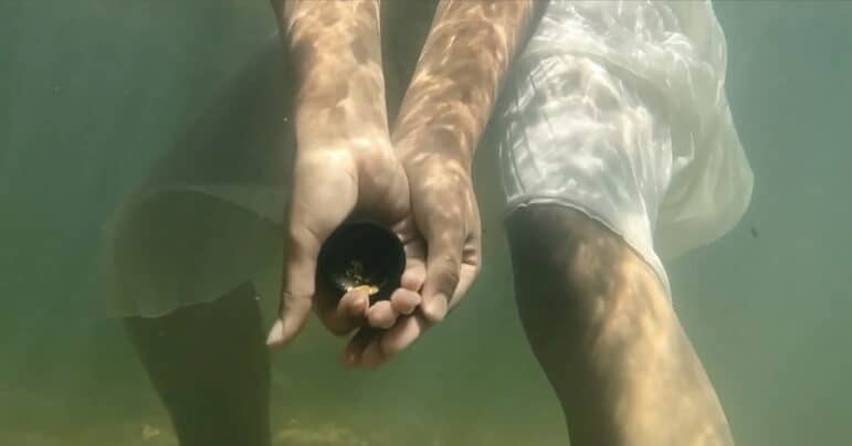 Throughout the film, Caycedo offers a payback of gold, or a pagamento, which is a traditional act of gratitude and reciprocity toward the earth. As we witness the act of hands and bodies engaging with gold and returning it to the river, Caycedo highlights how everyday gestures can affirm a commitment to the earth’s ecological balance. This act is deeply personal for the artist as the gold they return in the film had been previously purchased by Caycedo from artisanal miners for use in earlier artworks. Instead of remaining trapped in cycles of commodification and accumulation, the gold is intentionally given back to nature, honoring the river and the ecosystem of Santurbán in the process. This gesture of return sets the stage for the broader ritual and political dimensions of Caycedo’s practice.