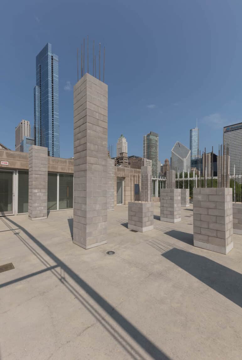 In 2019, Postcommodity exhibited With Each Incentive at the Bluhm Family Terrace, a publicly visible yet privately rentable space in the Art Institute of Chicago. The installation comprised eighteen columns made of cinder block and rebar, known as castillos through Latin America. These frameworks, which traditionally serve as anchors within buildings, ranged from one to five meters in height. The sheer weight of the sculpture prompted the museum staff, board members, and stakeholders to discuss the provocation of such a visually imposing artwork within the museum’s rental space and the impact on the building’s structural integrity.