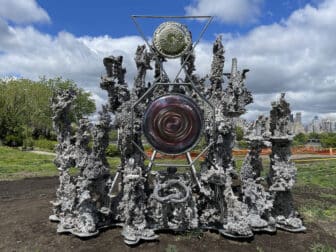 Informed by this context of persecution of life, Gaona gives way to new zones of possibilities in Spanning Worlds that assert the dignity sought in modalities of difference through the assertion of plurality and multiplicity. This is accomplished conceptually through the physical objects and language that render environments and people legible through the clear designation of the caps as migrant belongings, but also by the volume and shadows that the sculptural work casts. That is, Spanning Worlds’s nonmaterial qualities—the shadows it casts and the sonic or music tradition it evokes—produce immaterial and transmutable volumes and forms that reconfigure according to the particularities of its exhibited setting. Through this reconstitution of space via the immaterial, the artist reminds us of the capacity to account for the materially absent to serve as the catalyst for change. The artist’s play with the concepts of time and space through sculpture allows registers of identity to move beyond the minimizing forces that see life rendered as fixed, categorical units from which to extract profit.