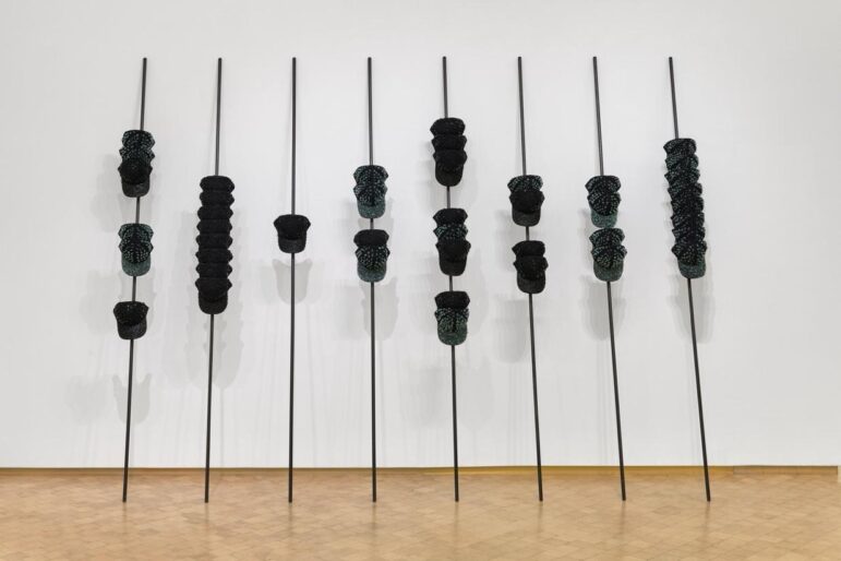 Verónica Gaona’s Spanning Worlds (2024) is a multimedia sculpture series consisting of several black caps studded with tinted and transparent glass shards salvaged from a Ford F-150 truck. The caps  are pierced and held together by steel rods and showcased resting vertically against the wall. When exhibited, the rods holding the black studded headpieces in place are displayed either individually reclined in the corner of gallery spaces, or as a grouping of rods whose narrow and elongated form is eased with the horizontal punctuation of caps that once belonged to migrants. This arrangement of punctuated rods visually evokes the non-traditional music notation found in graphic scores. While not graphic scores, the sculptural compositions of Spanning Worlds provide a glimpse towards the listening practices and sonic engagements of Gaona and those whom she is in communion with.1 She takes sculpture—an artistic medium with a rich history and tradition of engaging the living human body as an embodied subject—to attune audiences to sensorial possibilities that are not readily recognizable, such as the possibility to recall and imagine sonic environments through visual cues and without the presentation of sound.2 Additionally, Spanning Worlds‘s title echoes the core philosophical concept attributed to the Ejército Zapatista de Liberación Nacional (Zapatista Army of National Liberation, EZLN by its Spanish initials) of seeking “a world where many worlds fit.”3 I allude to this concept not to suggest that this is Gaona’s direct citation, but rather to emphasize that Spanning Worlds invokes a necessary and desired environment that recognizes and welcomes, rather than annihilates, the other.4 It does this through poesy and form as sculptural means and sonic allusions. I am also led to recall Antonio Gramsci’s concept of hegemony as it reminds us that the nefarious desire to do away with the other is established through a complex “process of moral, philosophical, and political leadership that a social group attains only with the active consent of other important social groups.”5 I situate Gaona’s Spanning Worlds in conversation with the Zapatista and Gramscian philosophical traditions to further draw attention to our individual role in contending with the hierarchical relationships and vetted interests that have come to shape our experienced environments.