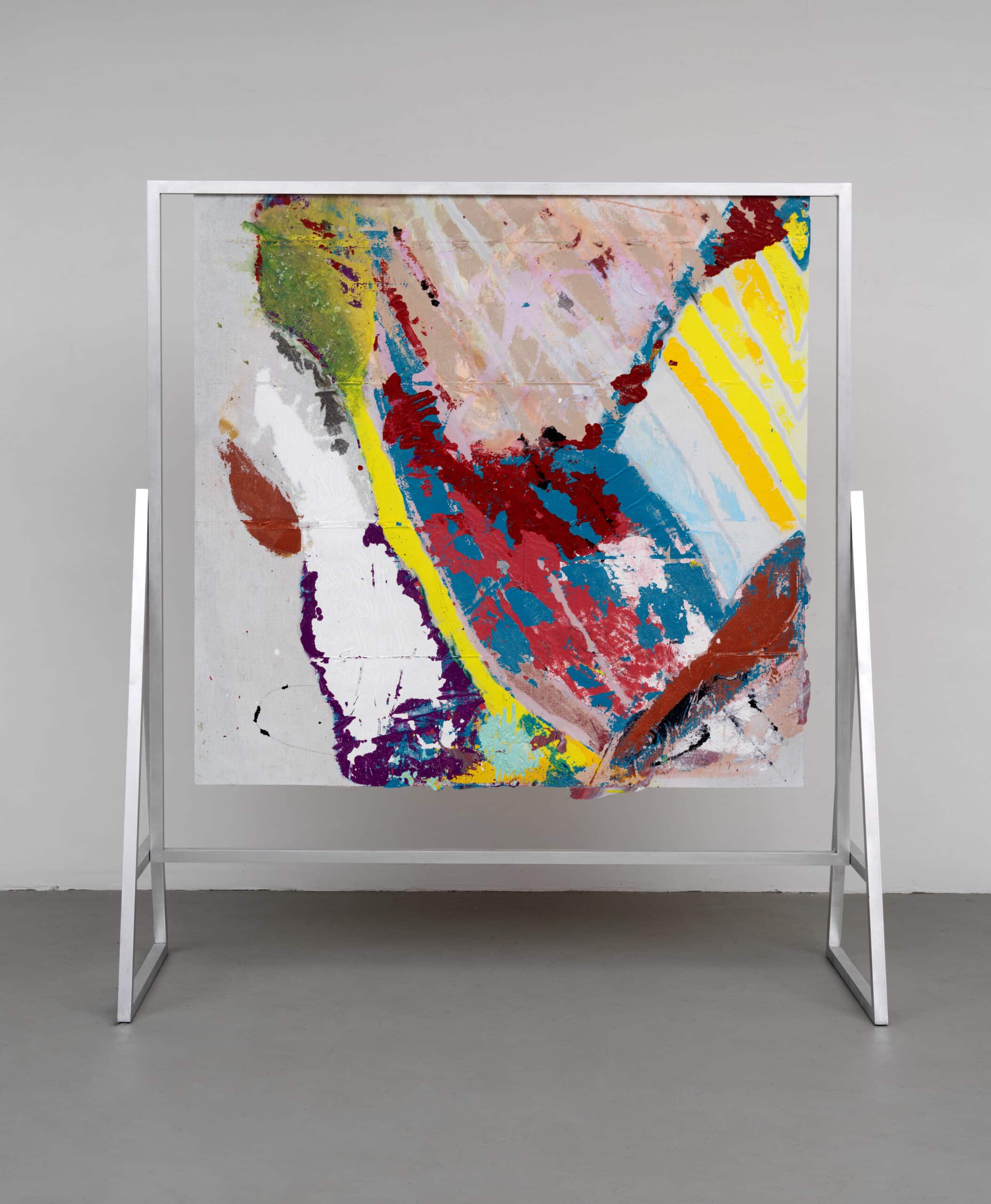The restless energy in Here to There is not only telegraphed to its verso side in crackles of caution yellow, shafts of opalescent grey-pink, blobs of terracotta brown, and sedimented layers of rainbows in decomposition, but also charges the painting as an object in space, anticipatory of its circulation not as an image on a wall but as a direct intervention into the social.