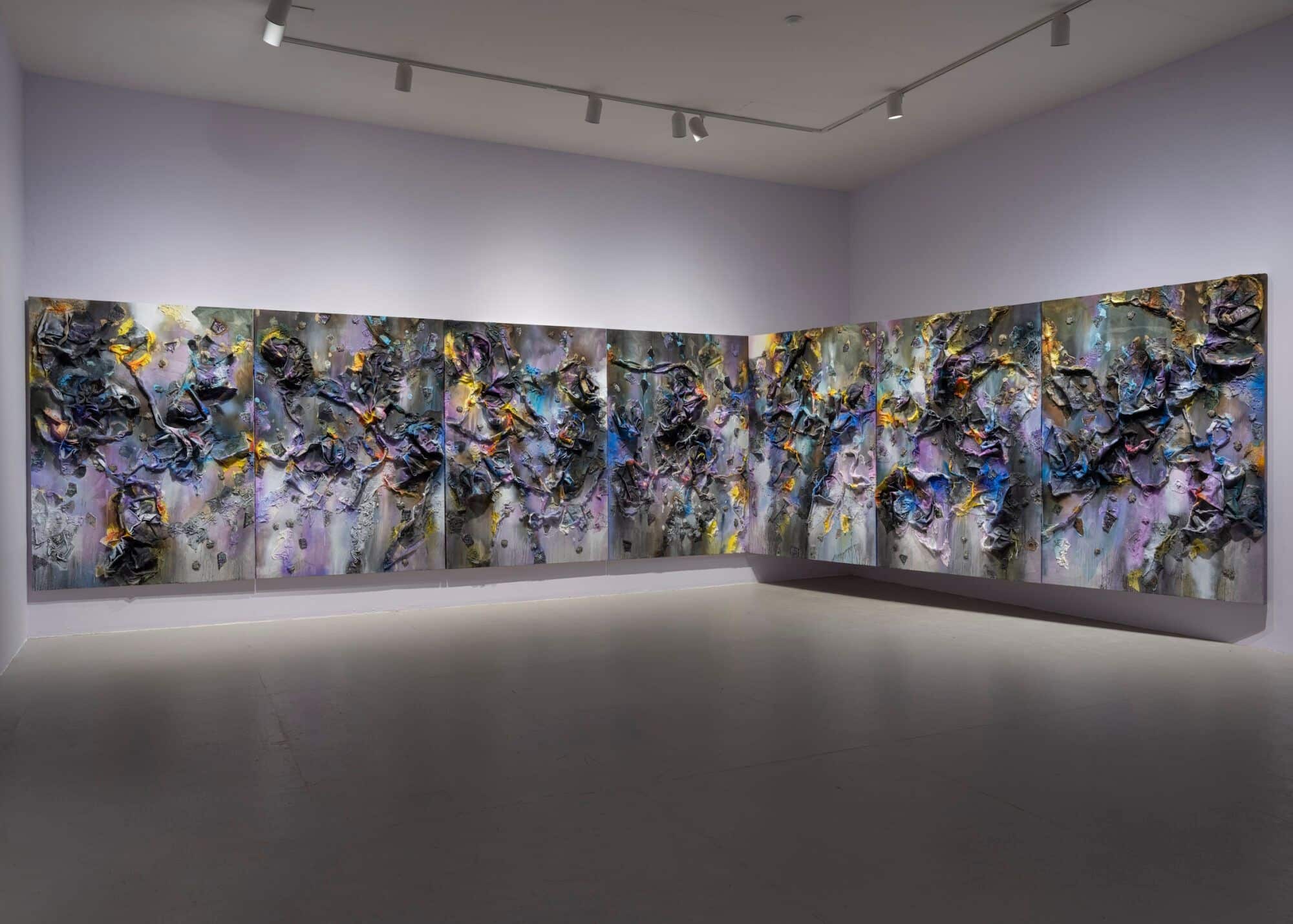 The painting combines Martinez’s trademark “starter” technique with a scale previously unmatched in their work, marking the first time Martinez has used materials such as Mylar balloons and iron silicate, a copper byproduct used as a blasting abrasive and a material common to construction sites. Equally fierce and dull fuchsias, violets, polleny yellows, high-key oranges, and butane hot blues bubble and ripple across the uneven surface of the work. Rather than rely on the existing architectural support of the gallery corner, this large, multipanel painting extends three-dimensionally into the room, with four panels affixed to one wall and the adjacent three extending to meet the other wall at a point. It is a corner piece that appears to resist the corner. Put another way, the work is quite literally bent.